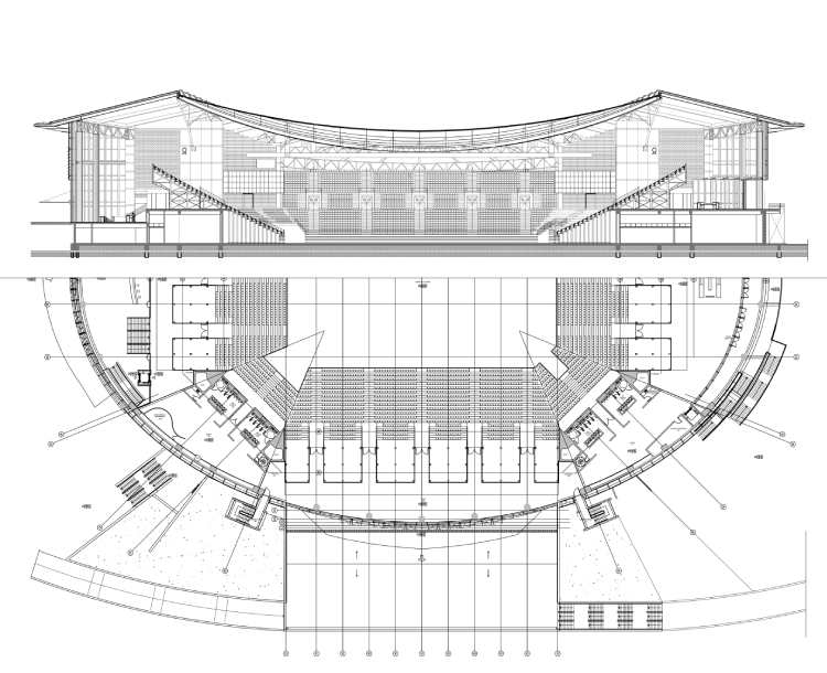 The building is composed of the main hall arena – with two levels of stands on its lower level – and two buildings of smaller volume on each side of the arena, with paved roofs accessible for general use and serving as entrances-exits of the building on the second level.